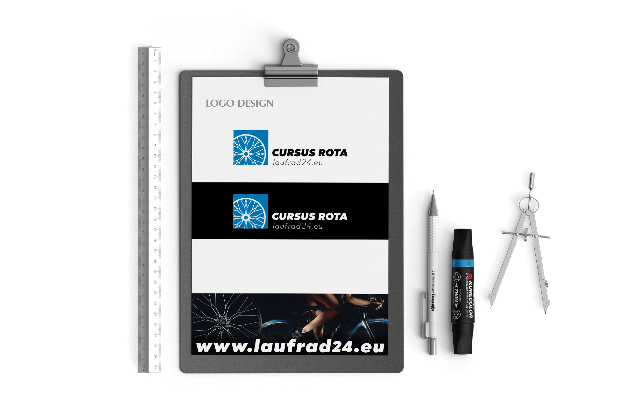 Logoerstellung Schriftzug mit Grafik und Schriftzug mit Imagefoto und Laufradpräsentation für Online-Shop.