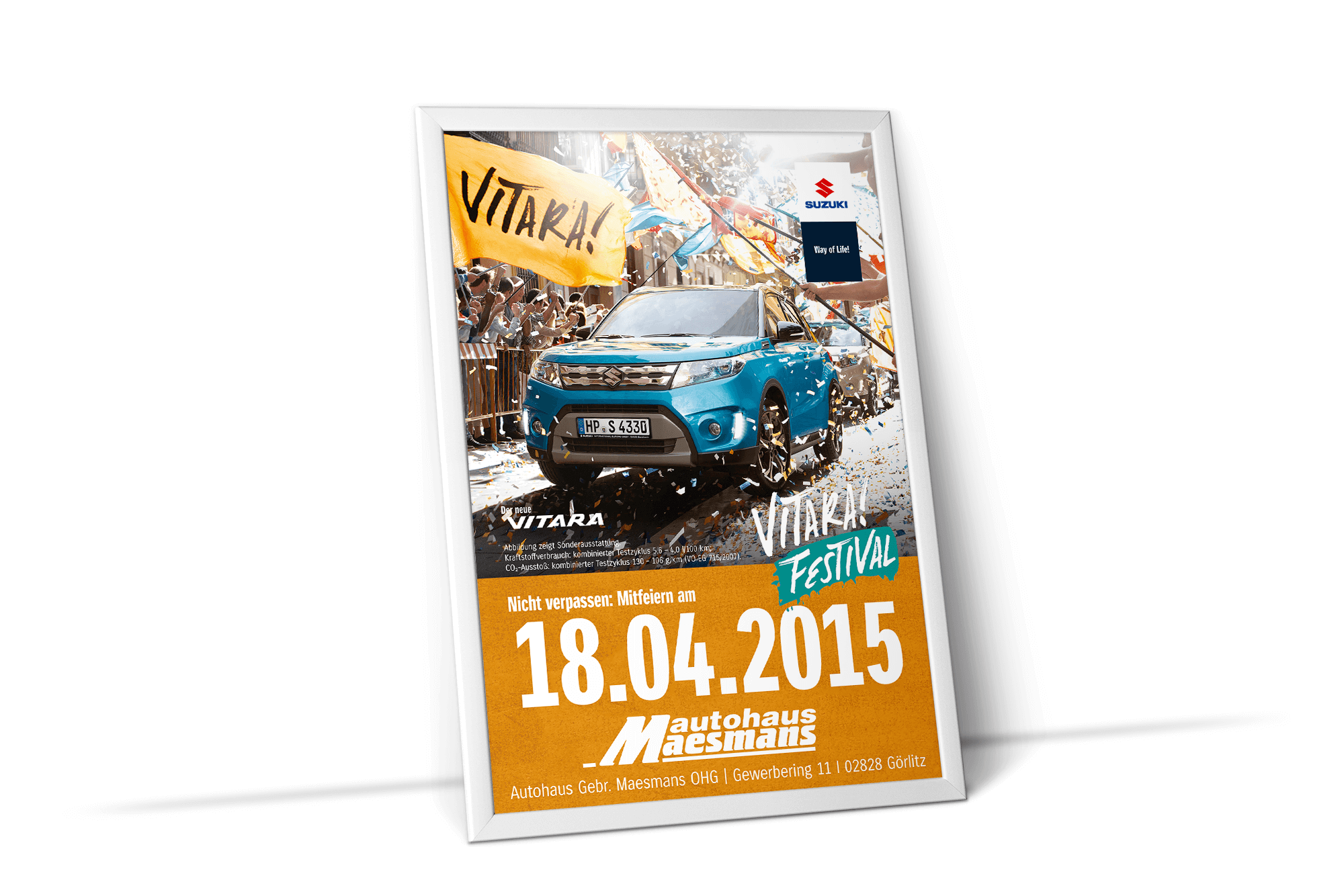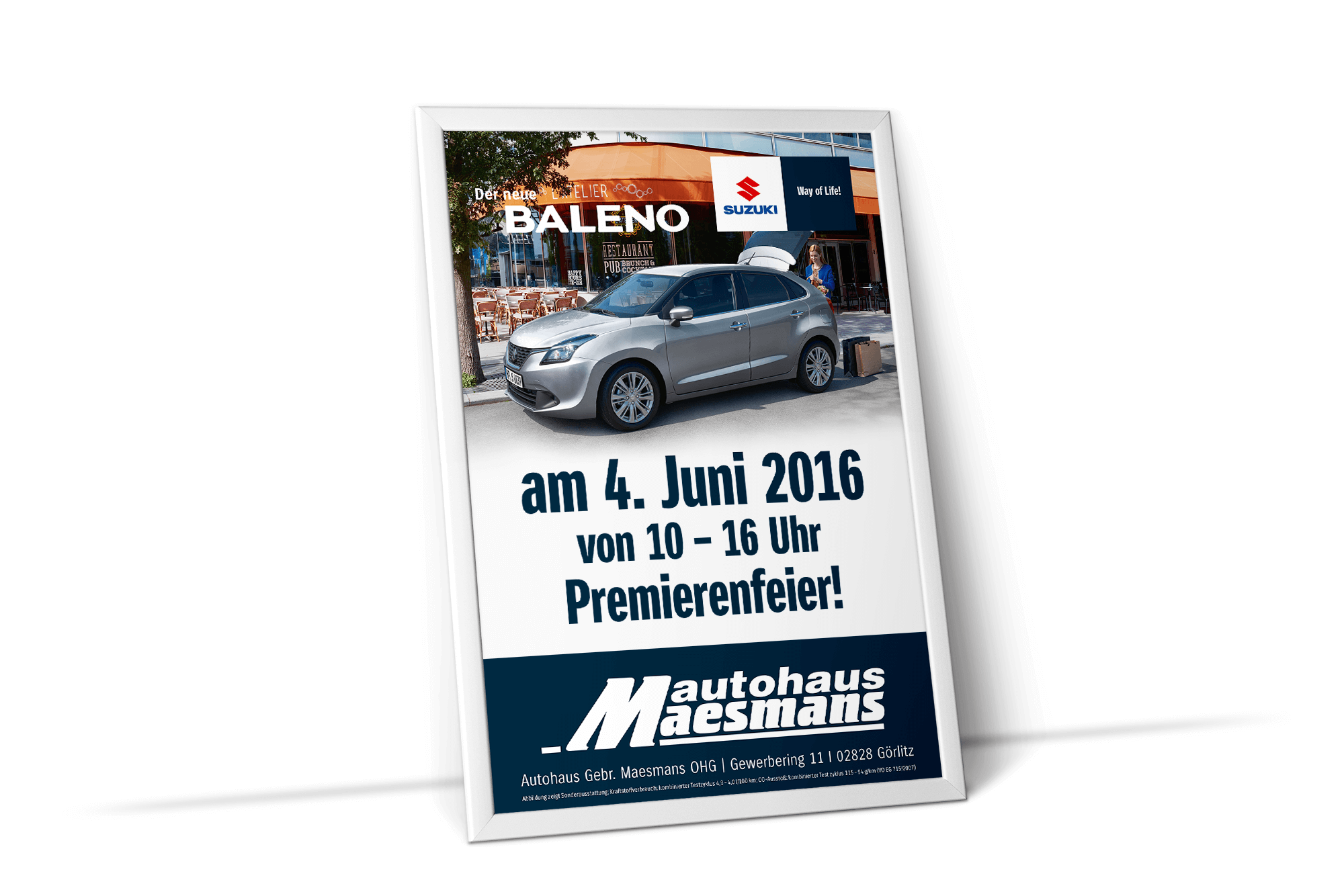 Erstellung markantes Plakat für den Außenbereich. Premierenfeier Suzuki Baleno im Suzuki CI.