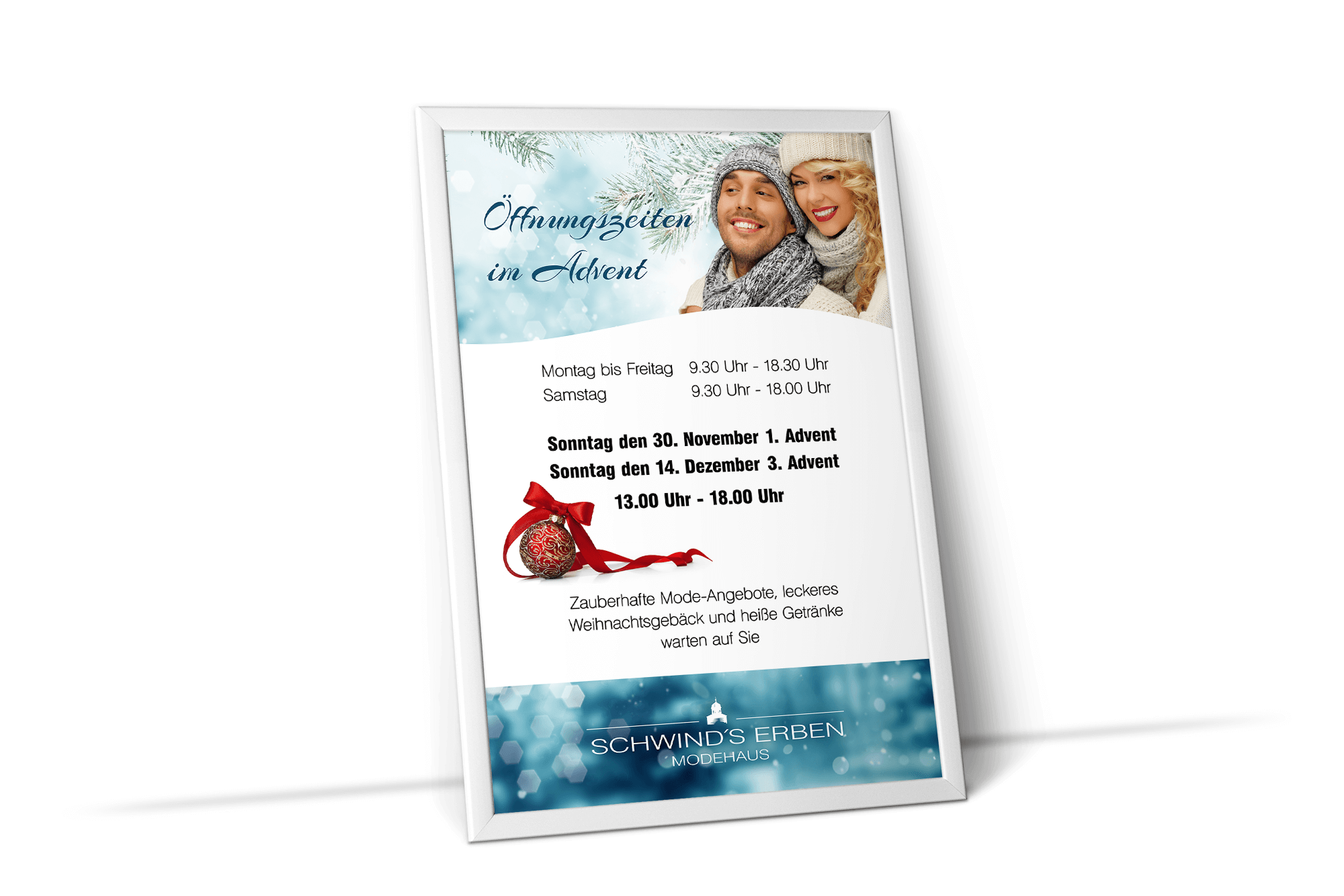 Erstellung Plakat für Außenbereich im Weihnachts-CI mit Sonder-Öffnungszeiten.