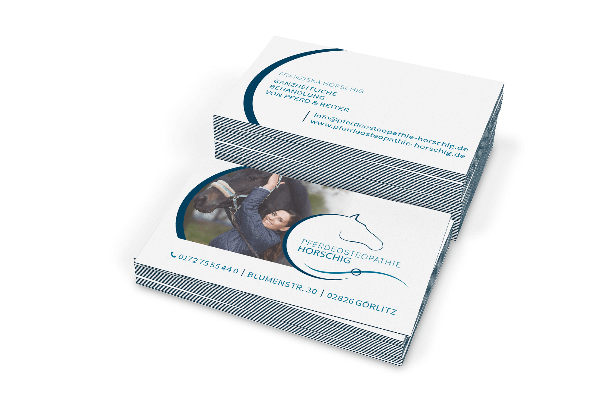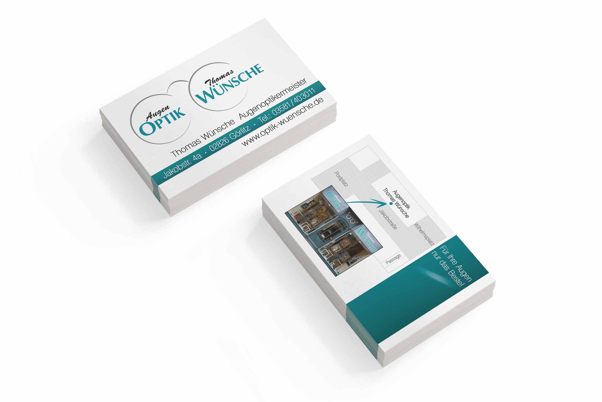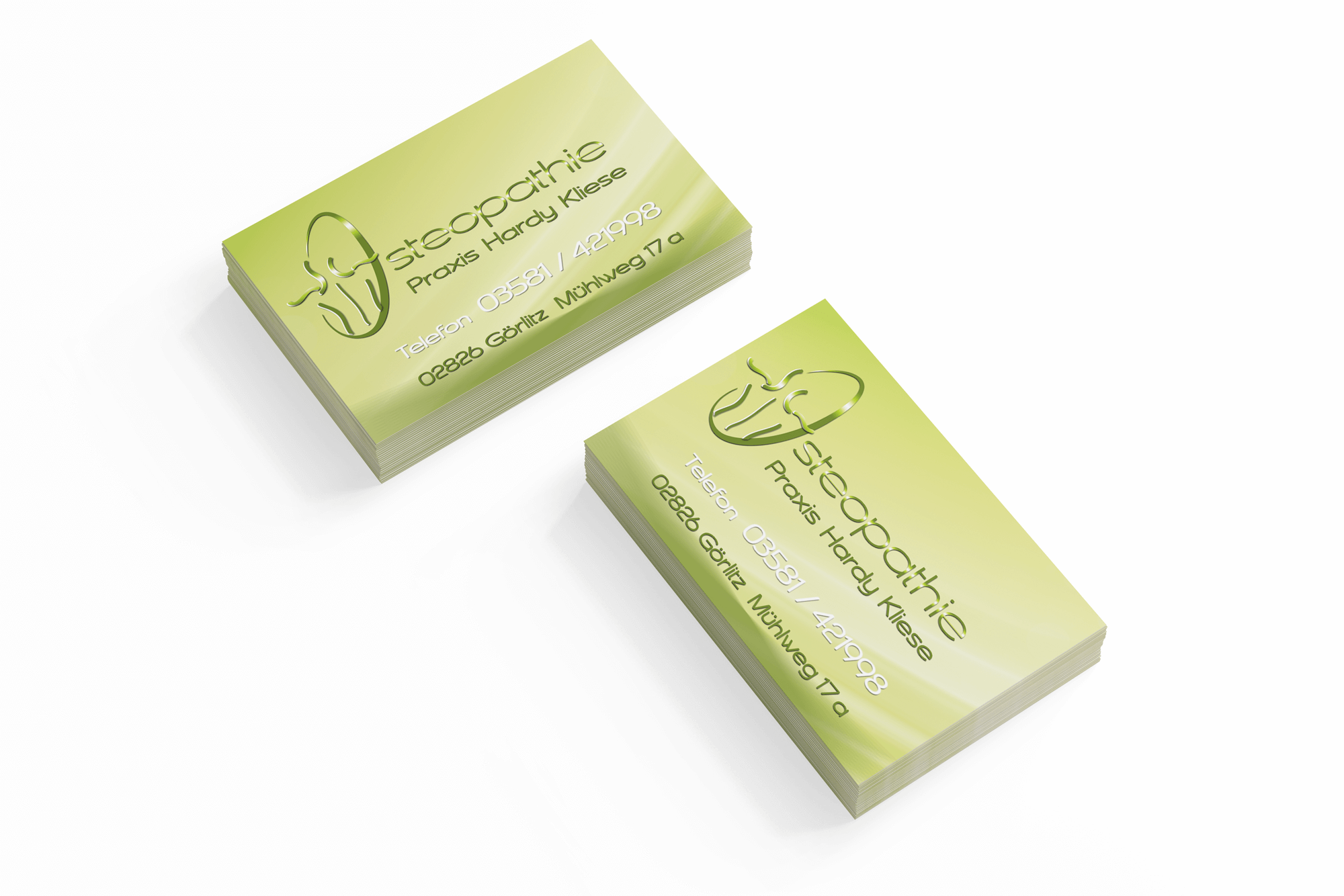 Klapp-Visitenkarten quer 4/4 farbig mit einseitigem partiellen UV-Lack, 350g hochwertiger Qualitätsdruck, beidseitig folienkaschiert matt mit Softtouchfolie, 4/4 farbig Endformat ungefalzt: 172 x 55 mm gefalzt: 90 x 55 mm