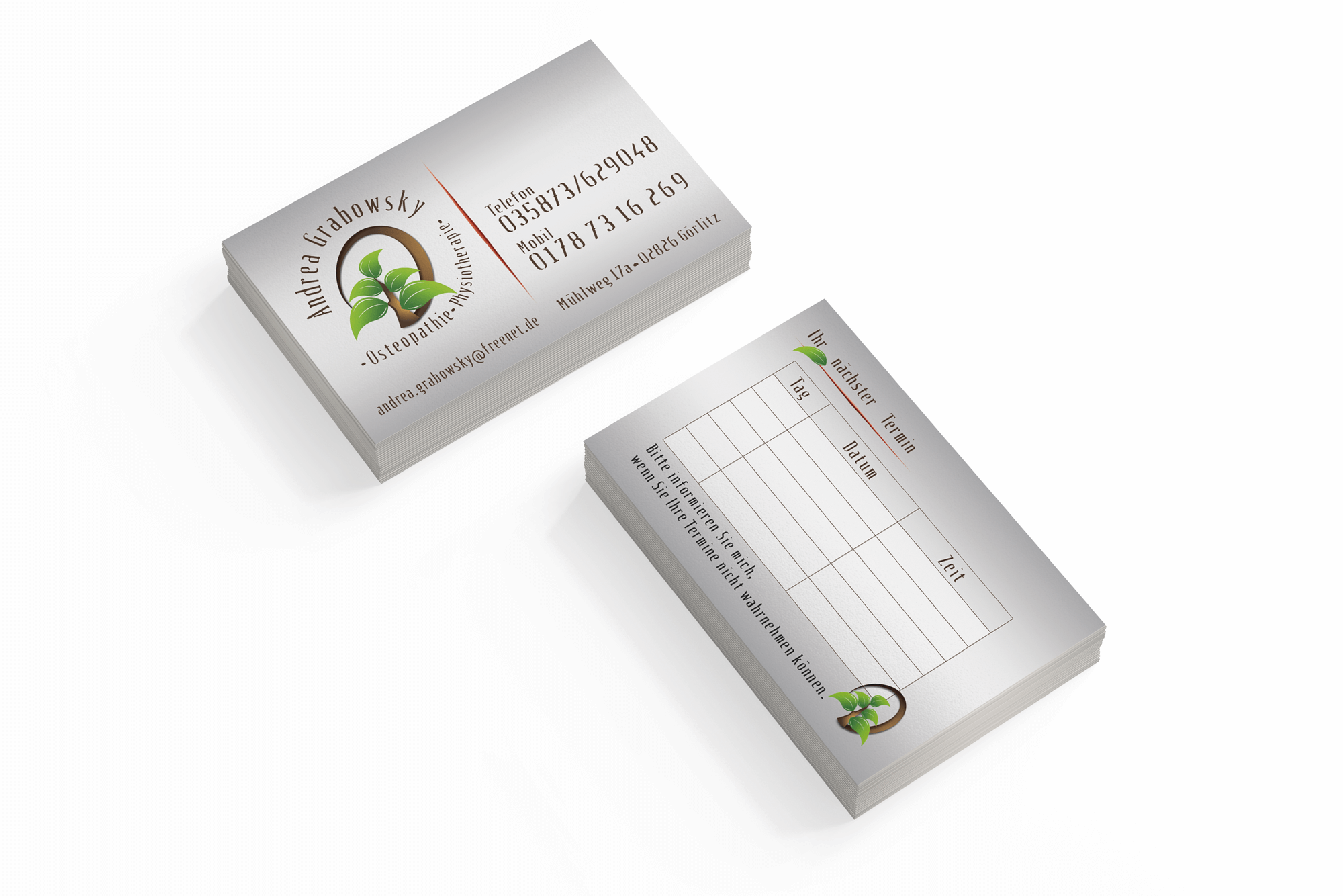 Erstellung Visitenkarte 2-seitig im Corporate Design der Physiotherapie.